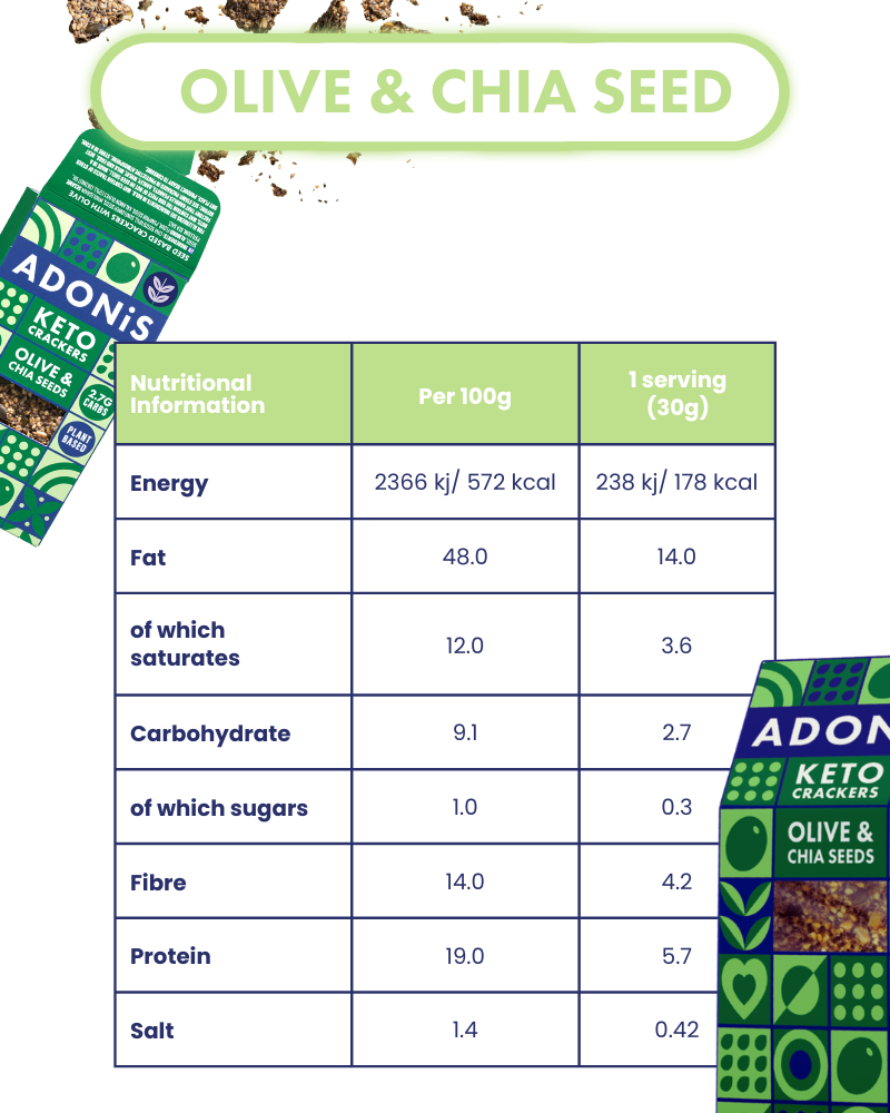 Our Olive & Chia Seed Keto Crackers combine nutrient-rich seeds with aromatic olives and omega-3 packed chia seeds. This blend delivers natural antioxidants and a high amount of fibre to keep you fuller for longer. Made from 100% plant-based, organic ingredients and free from refined sugars or artificial additives, these crackers offer a wholesome, savoury crunch. Perfect on their own, with dips or as a low-carb bread alternative for any time of the day.